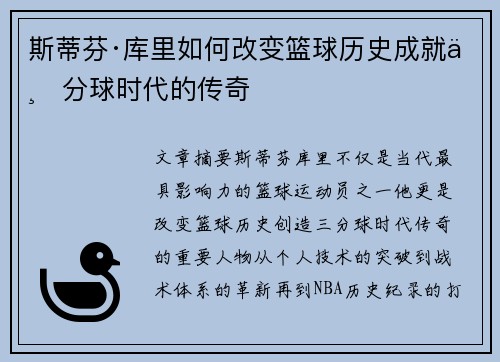 斯蒂芬·库里如何改变篮球历史成就三分球时代的传奇